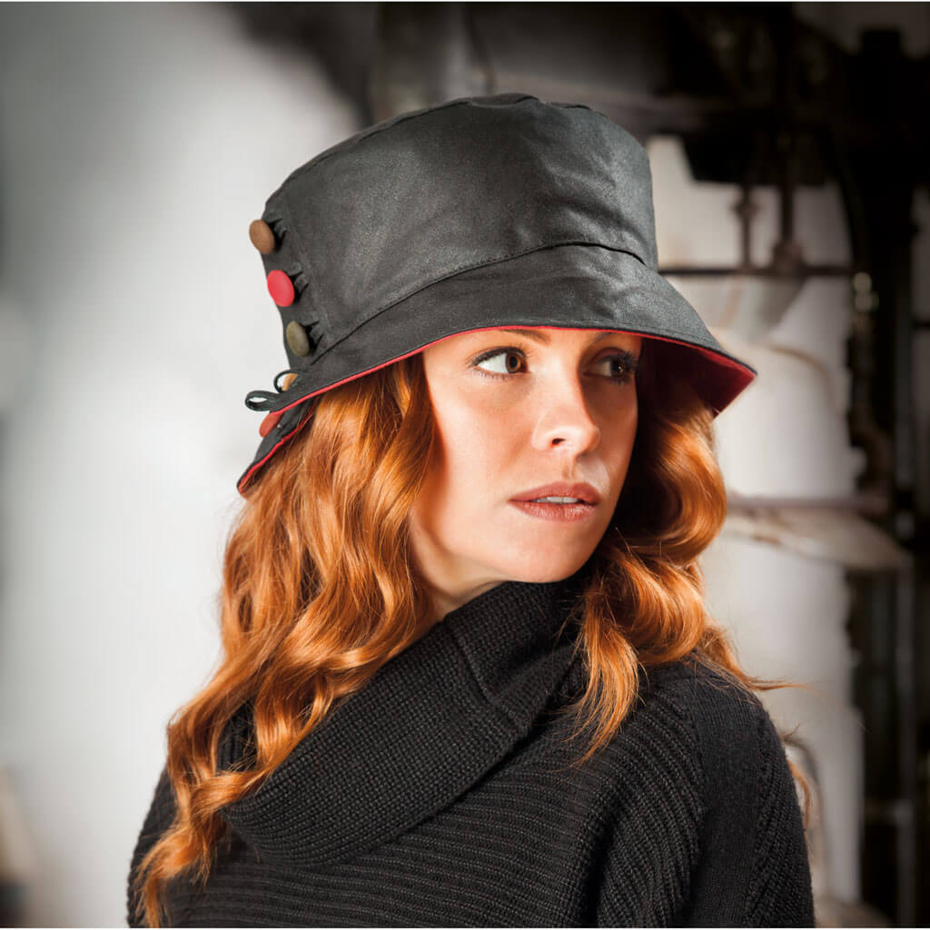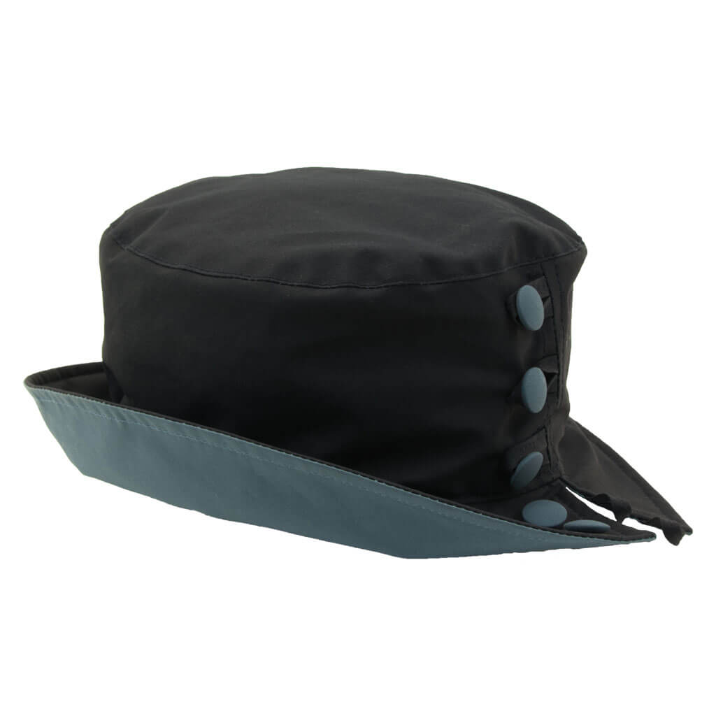 Embrace the weather and love the rain in this beautiful waterproof hat. The colourful buttons adds stylish detailing - undo the bottom two buttons to allow a split brim. You can wear this hat in a number of ways, either with the brim turned down or with the brim turned up showing the beautiful secondary colour of the hat. The soft fleece lining ensures comfort and warmth.