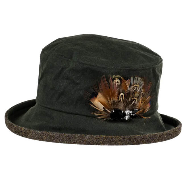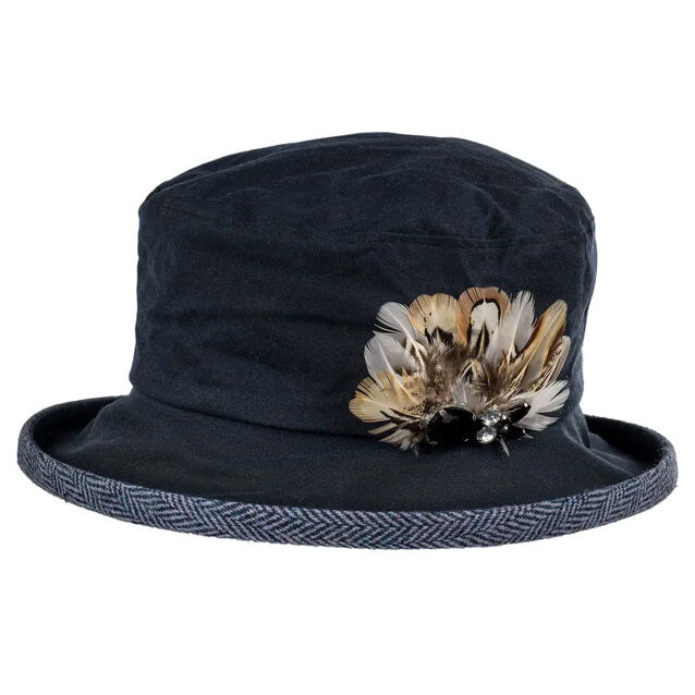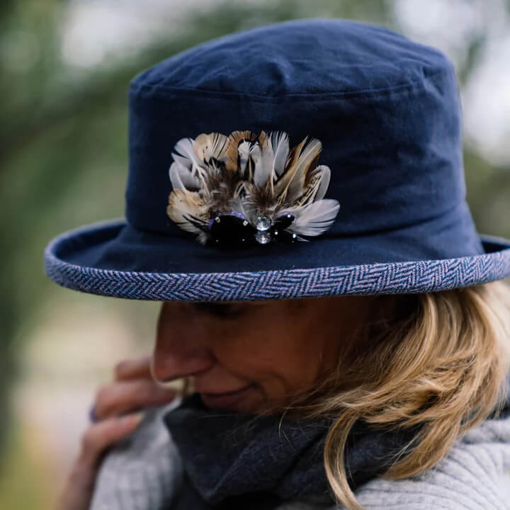 Finished with an elegant feather trim, this waxed cotton rain hat brings a distinctive, handcrafted feel, making each piece unique. Lightweight yet durable, Nicola is ideal for everyday wear, travel, dog walking, and outdoor adventures where you want to stay dry and look polished.